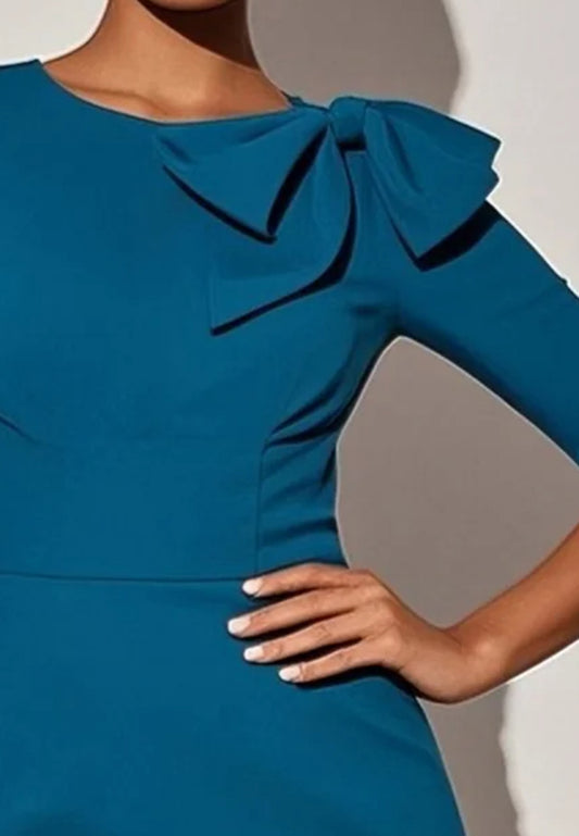 Cyan Bow Classic Crew Neck Half Sleeve Sheath Midi Dress