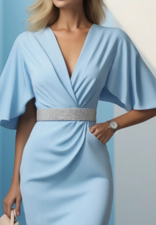 Work Dress Blue V Neck Belted Short Sleeve Midi Dress