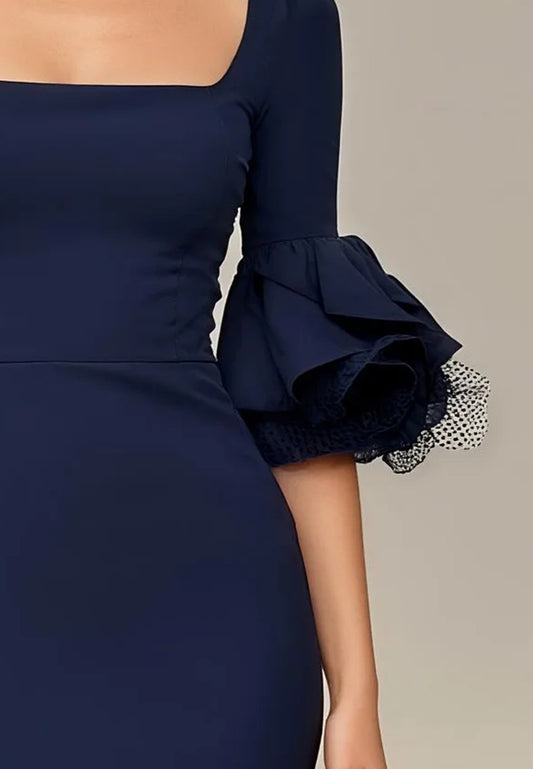 Navy Blue Mesh Classic Square Neck Half Sleeve Bell Sleeve Sheath Midi Dress