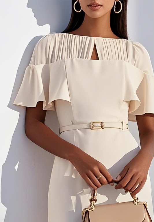White Buckle Classic Crew Neck Short Sleeve Sheath Midi Dress