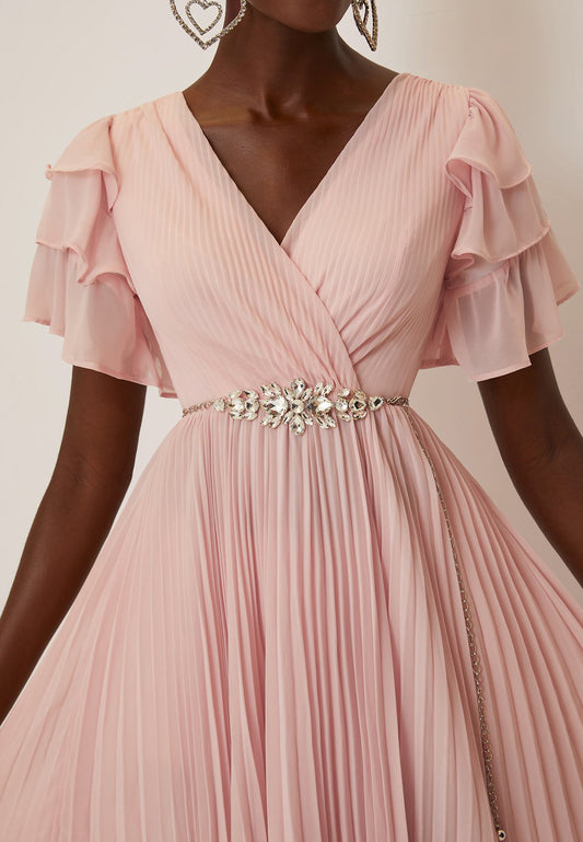 Pink Pleated Rhinestone Chiffon V Neck Short Sleeve Ruffle Sleeve A-Line Maxi Dress