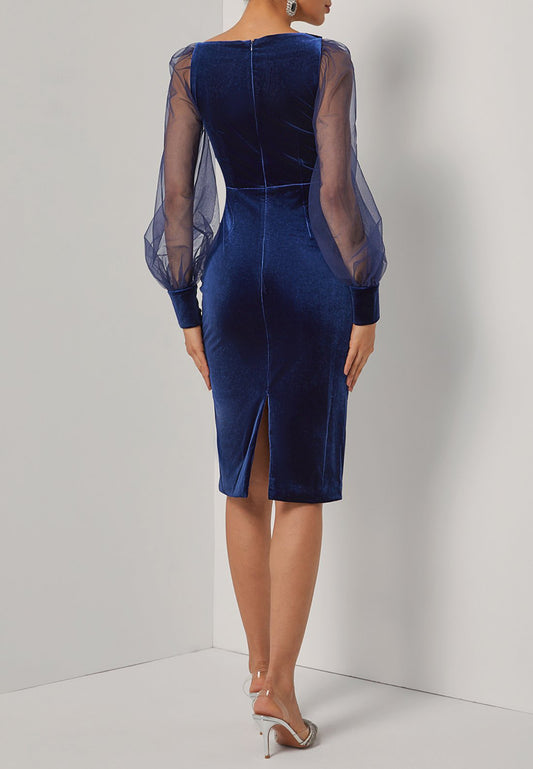Purplish blue Split Joint Mesh Velvet Long Sleeve Balloon Sleeve Sheath Midi Dress