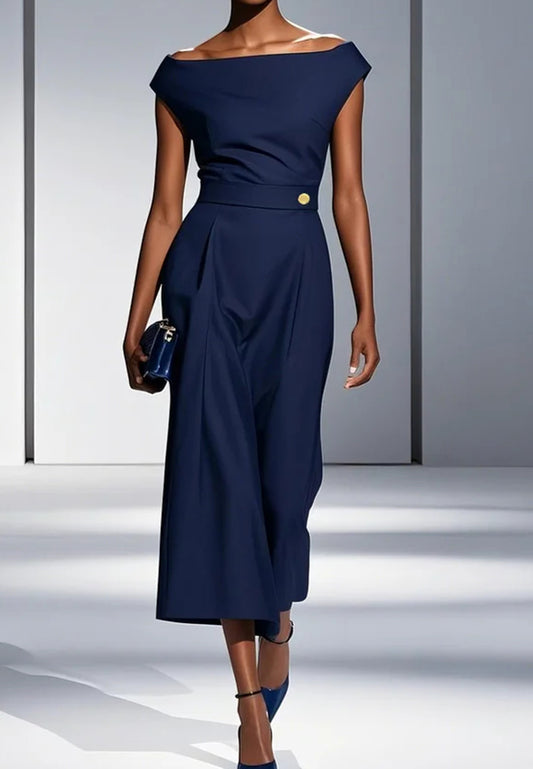 Purplish blue Buckle Classic Off The Shoulder Cap Sleeve A-Line Midi Dress