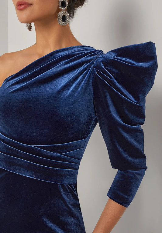Royal Blue Velvet One Shoulder Three Quarter Sleeve Sheath Midi Dress