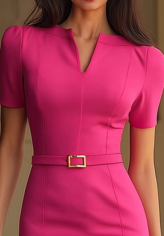 Work Dress Pink V Neck Belted Knee-Length Dress