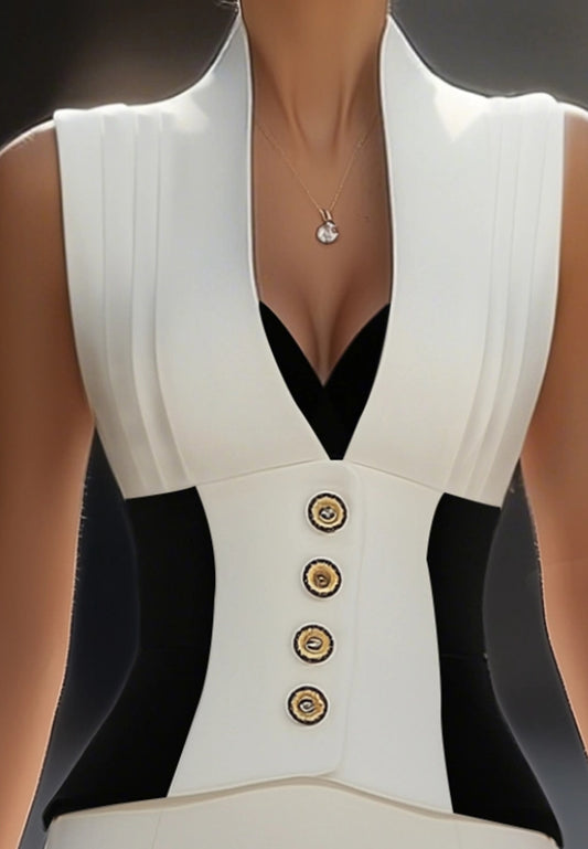 Work Dress Black White V Neck Colorblock Knee-Length Dress