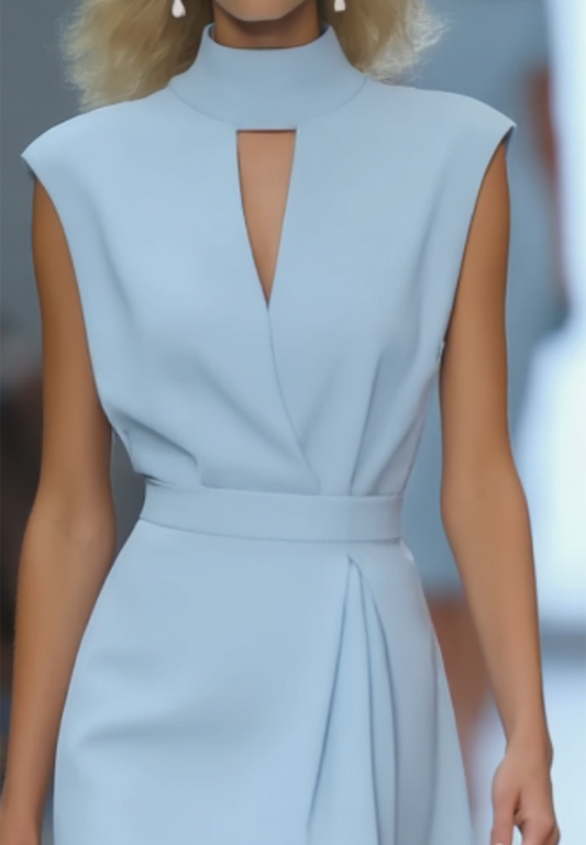 Work Dres Blue Sleeveless Stand Collar Knee-Length Dress