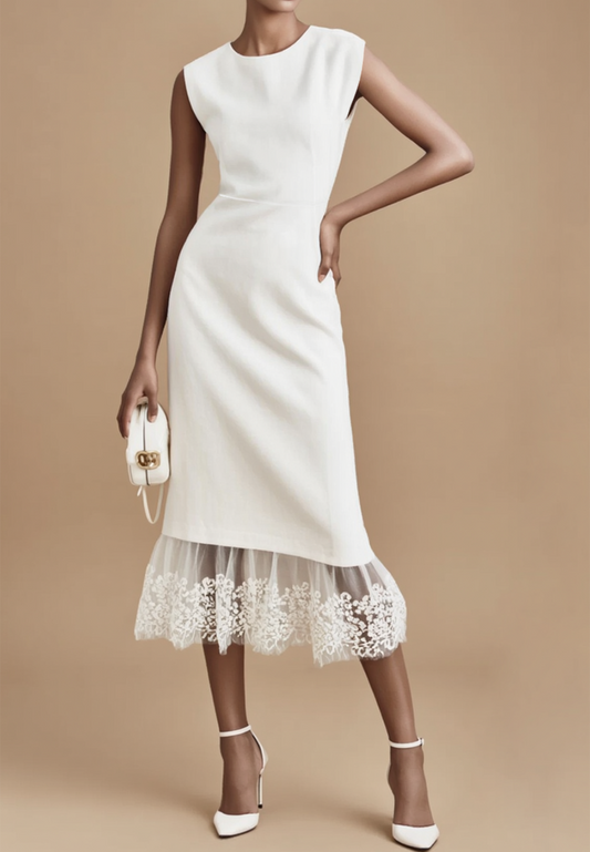 Off White Lace Edge Slit Sleeveless Sheath Midi Dress