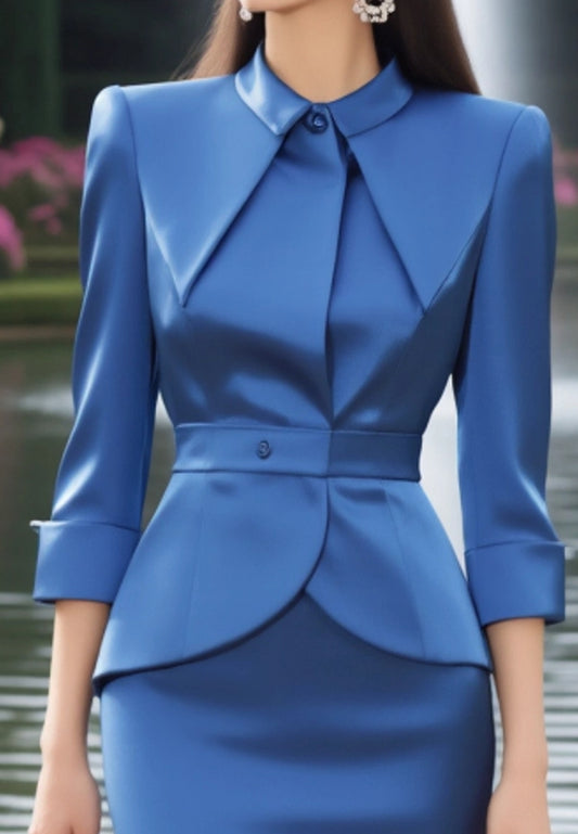 Wedding Guest Dress Blue Lapel Midi Outfit Sets Skirt Set