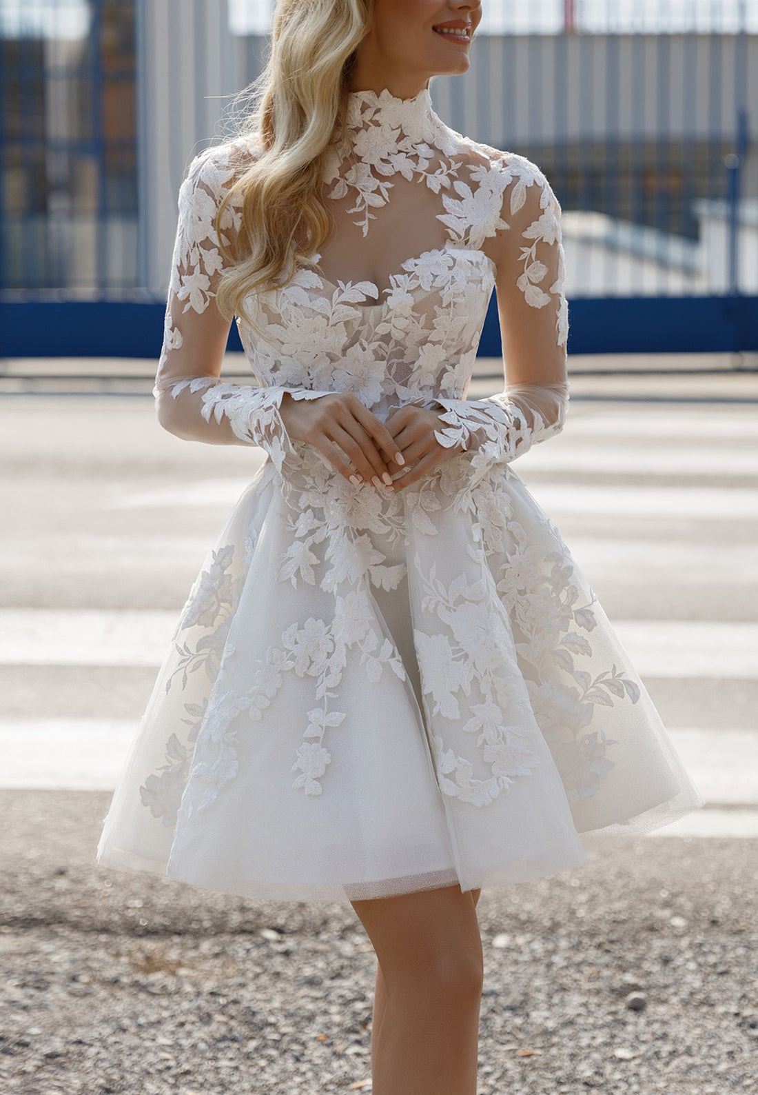 High Neck Long Sleeves Lace Appliques Pleated Short A-Line Wedding Dress