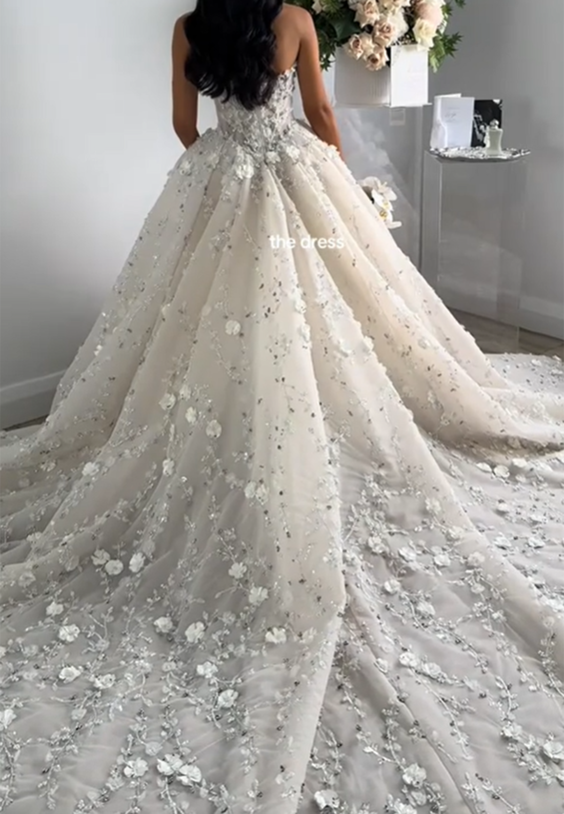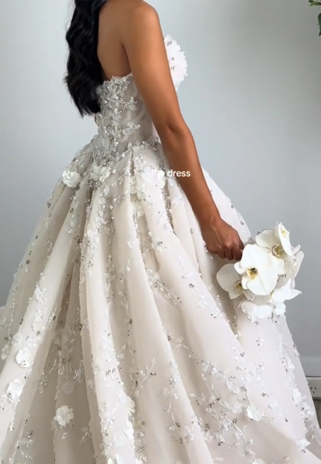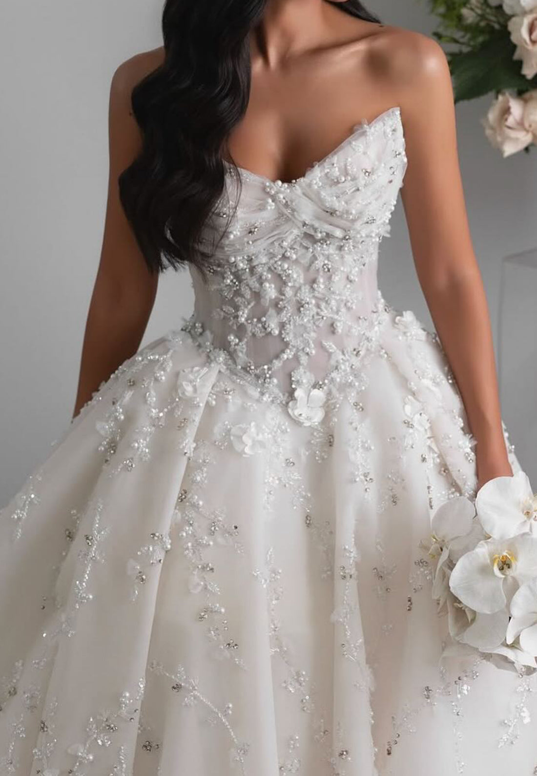 Elevate your bridal look with this sweetheart sleeveless ball gown, adorned with delicate beaded embroidery that adds a refined touch of elegance. The flowing silhouette creates a timeless, graceful presence, perfect for making a memorable entrance on your special day. Crafted to highlight your figure while offering comfort, this gown embodies sophistication and classic beauty.