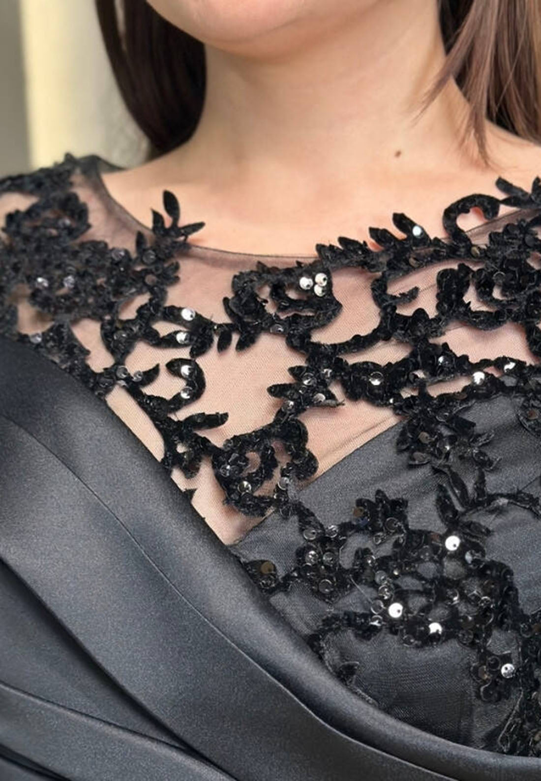 This stunning mother of the bride dress features a classic scoop neckline, elegant long sleeves, and delicate applique detailing. The pleated A-line silhouette flatters all body types and creates a timeless look for any special occasion. Feel confident and sophisticated in this exquisite piece.