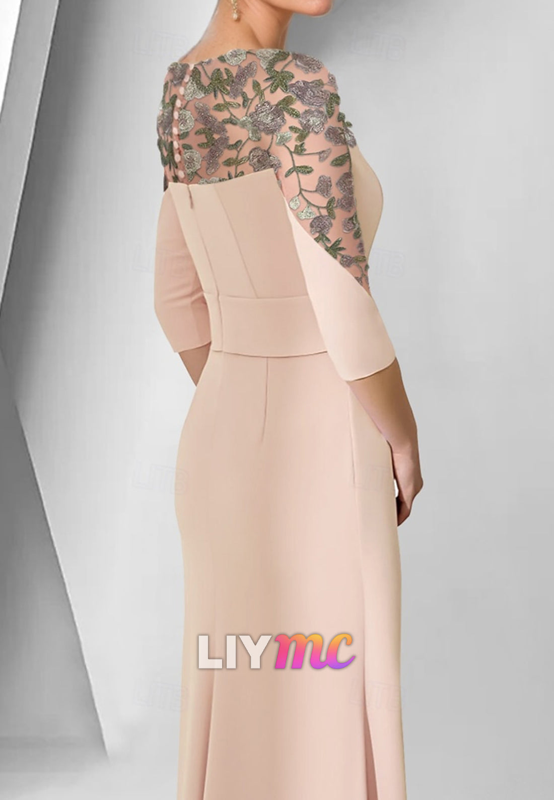 Scoop Appliques Long Sleeves Ruched Sheath Mother of Bride Dress