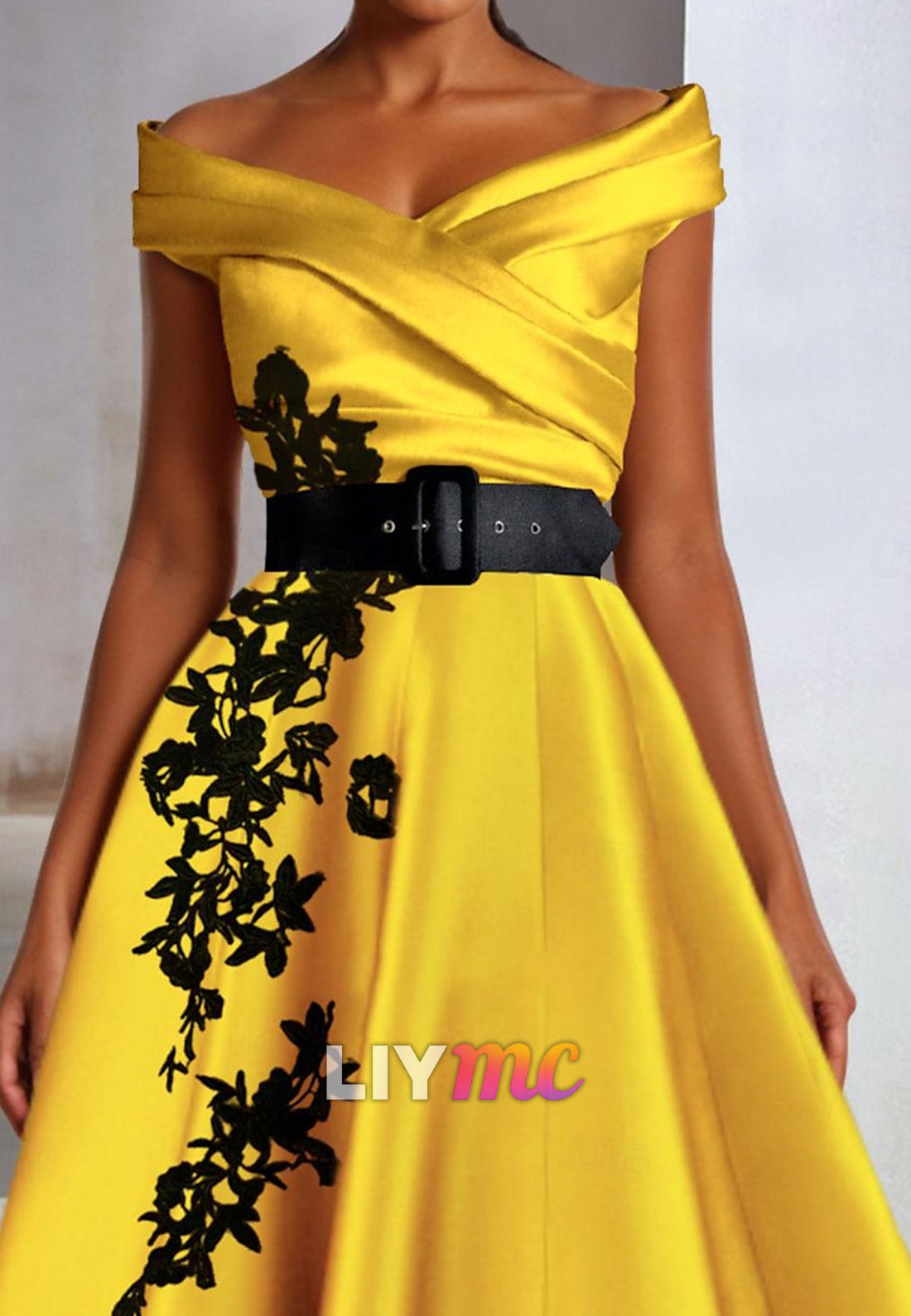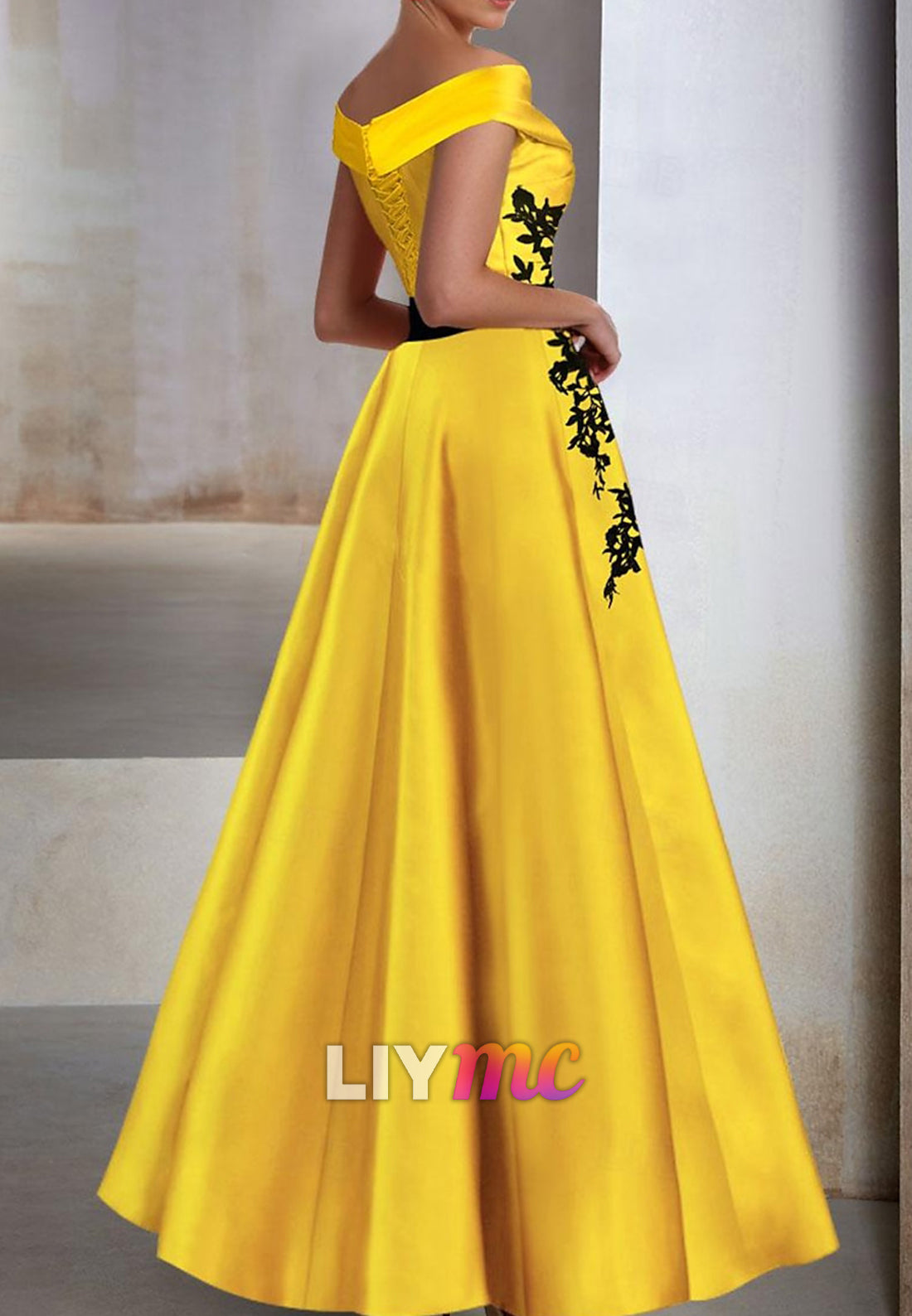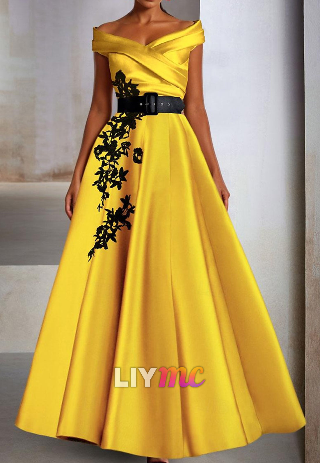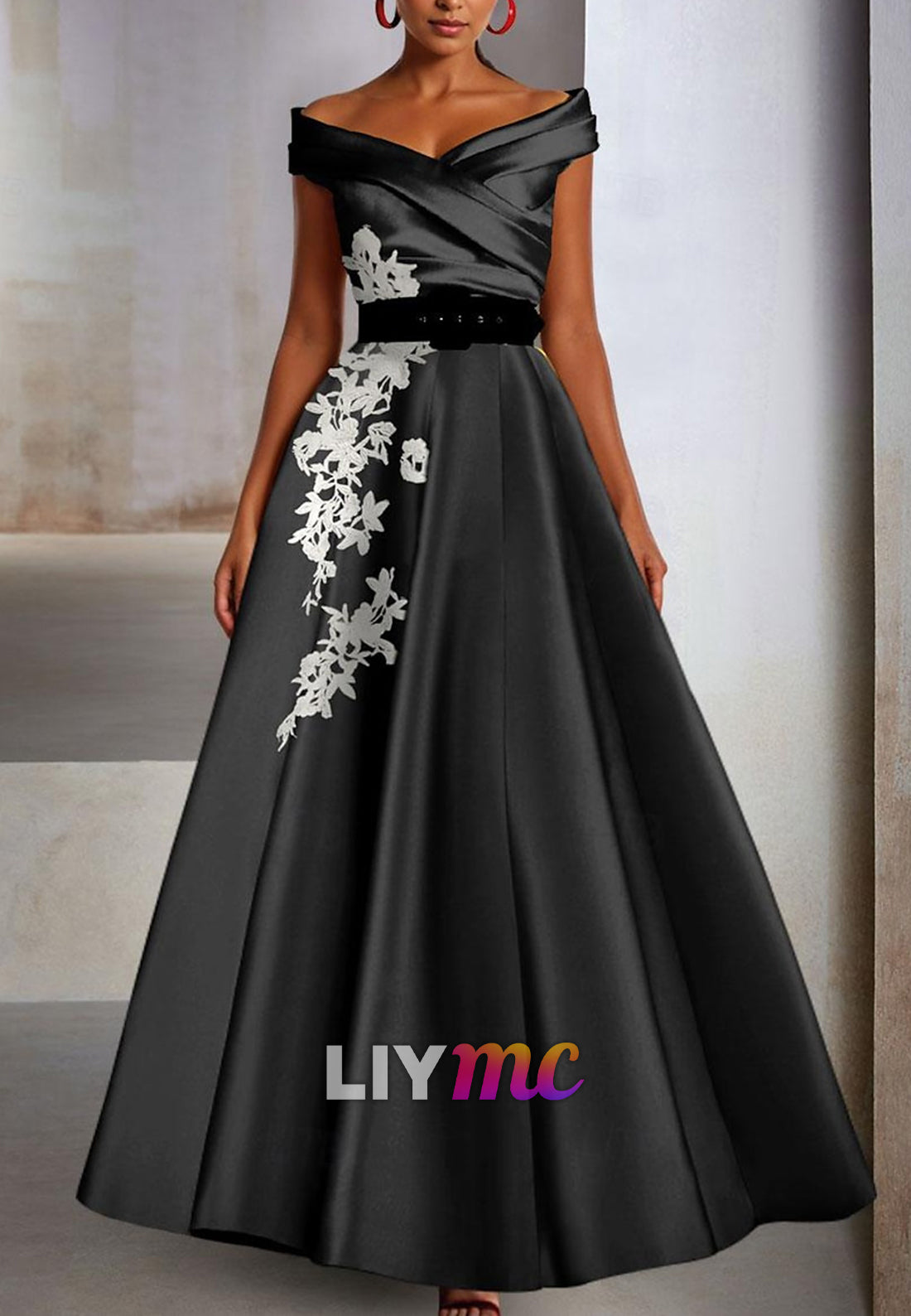 This sophisticated mother of the bride dress features a flattering V-neckline and sleeveless design. Delicate appliques adorn the elegant A-line silhouette, creating a graceful and timeless look perfect for your special day.