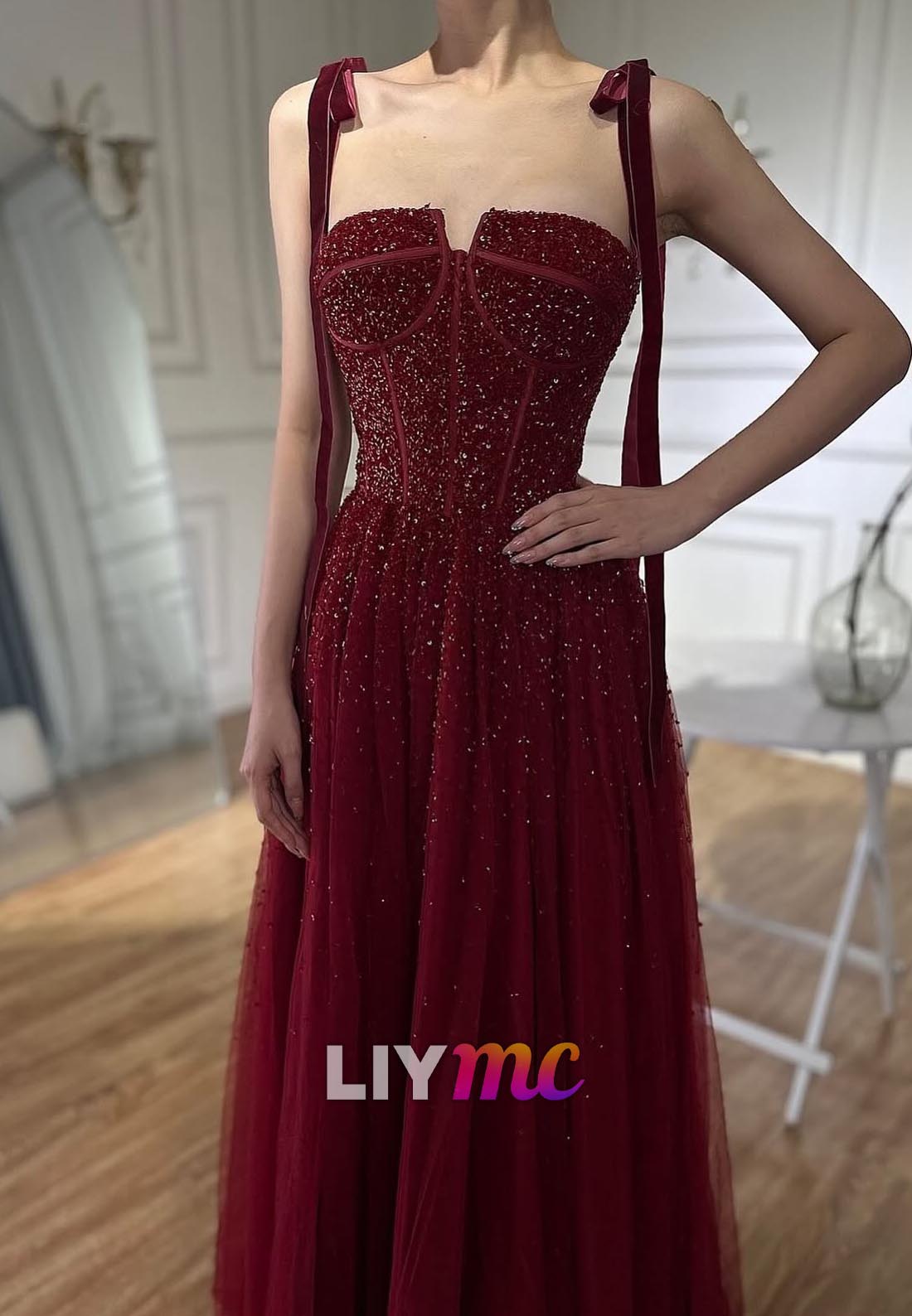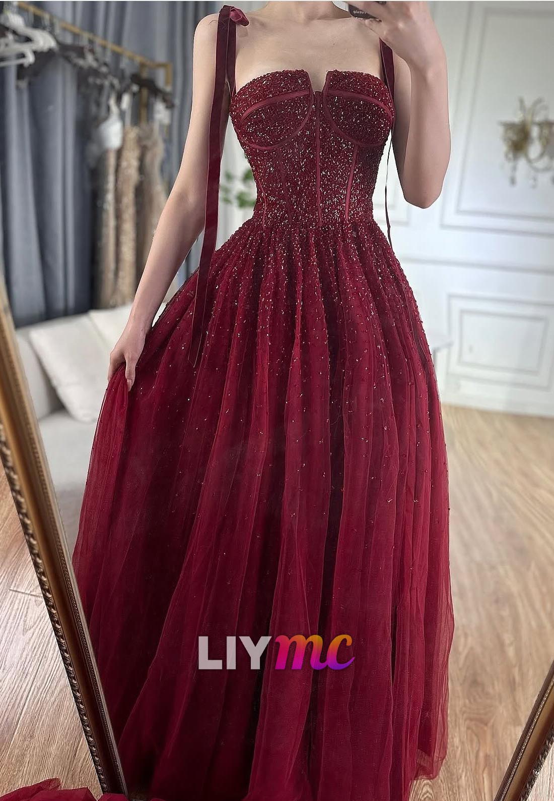 Square Straps Beaded Tulle Sparkly Prom Dress