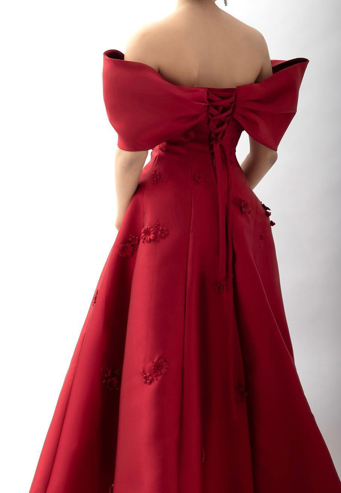 Off-Shoulder Floral Embellished Red Satin A-Line Prom Dress x 1;