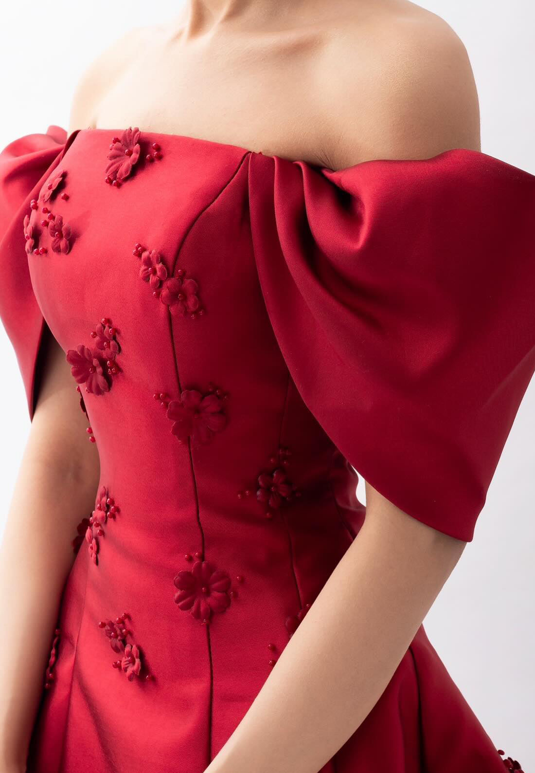 Off-Shoulder Floral Embellished Red Satin A-Line Prom Dress