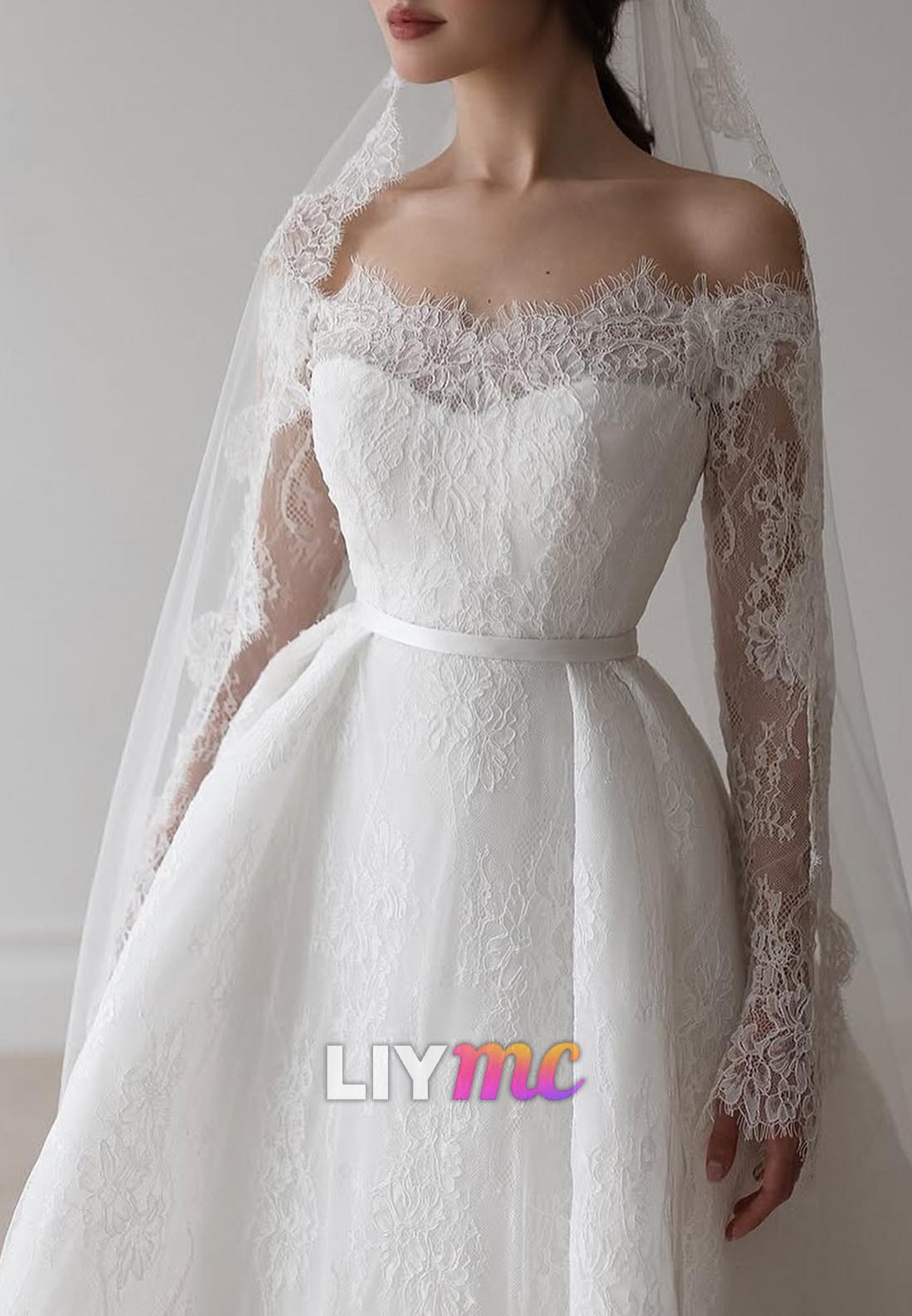 Off-Shoulder Long Sleevess Lace Appliques A-Line Wedding Dress