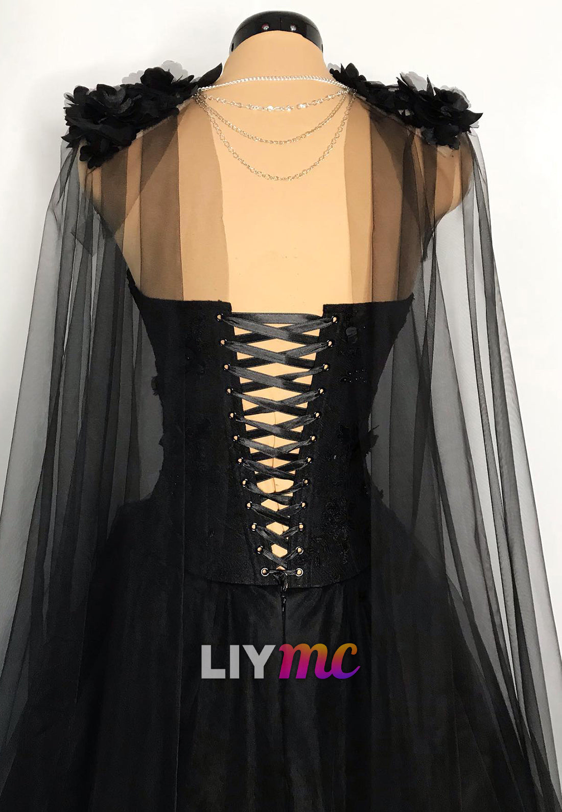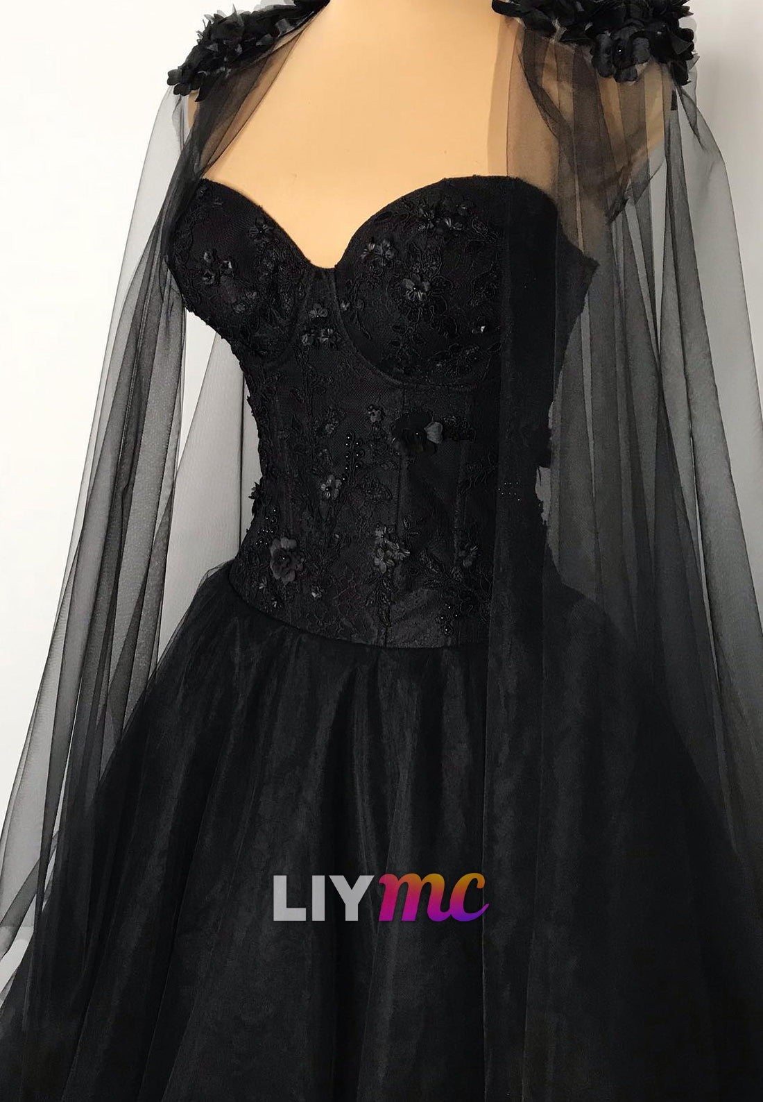 This black A-line wedding dress features a romantic sweetheart neckline and a sleeveless design, adorned with delicate appliqués on soft tulle fabric. Its elegant silhouette combines timeless sophistication with striking contrast, creating a refined and modern bridal look.