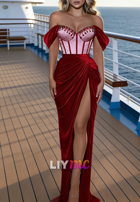 Sweetheart Velvet Beaded Side Slit Sheath Prom Dress