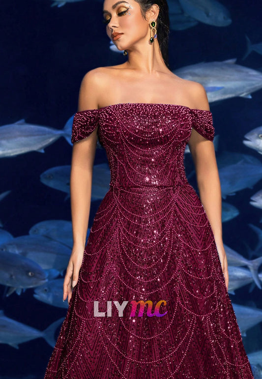 Off-Shoulder Beaded Embroidery Sparkly A-Line Prom Dress