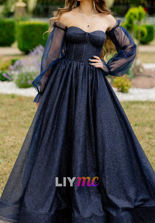 Off-Shoulder Long Sleeves Spaghetti Straps A-Line Prom Dress