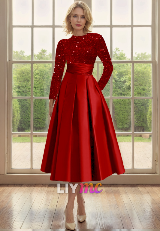 High Neck Long Sleeves Sequins Pleated A-Line Mother of Bride Dress Cocktail Dress