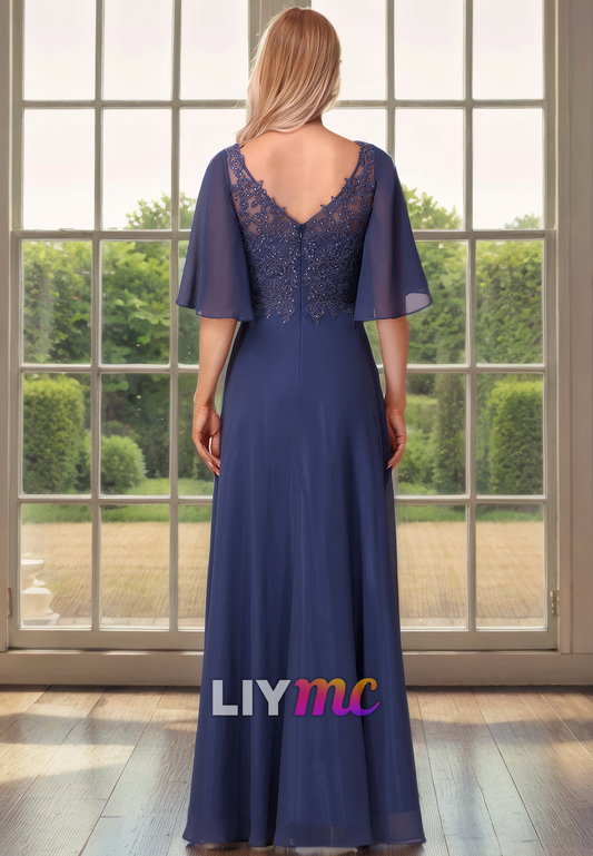 V-Neck Half Sleeves Appliques Beaded Chiffon Pleated A-Line Mother of Bride Dress Cocktail Dress
