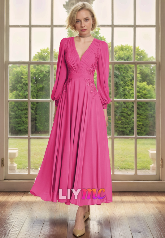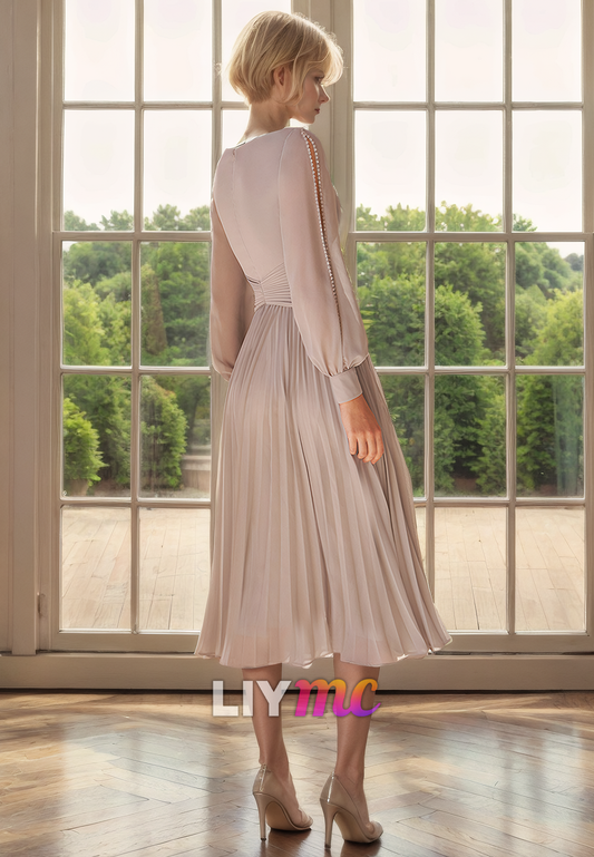 V-Neck Long Sleeves Chiffon Pleated A-Line Mother of Bride Dress Cocktail Dress