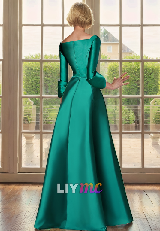 M1323 - Scoop Long Sleeves Sleek Satin Pleated High Slit Mother of Bride Dress Cocktail Dress