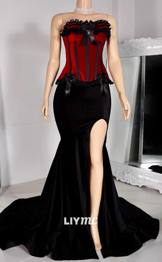 LP1961 - Scoop Strapless Appliques Sheer High Slit Mermaid Prom Dress