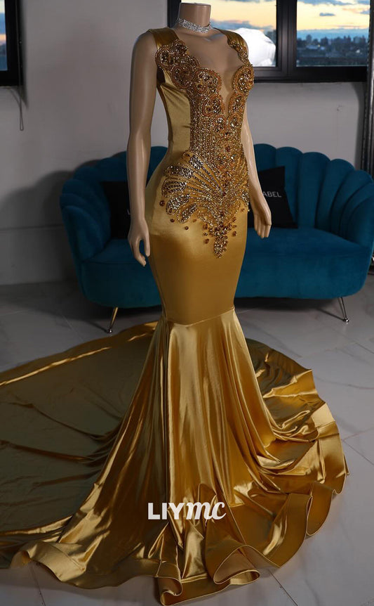 LP2072 - Low V-Neck Sleeveless Sleek Satin Mermaid Prom Dress