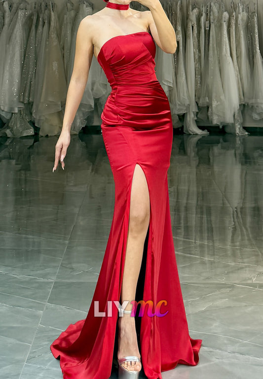 V-Neck Strapless Pleated Side Slit Sheath Prom Dress