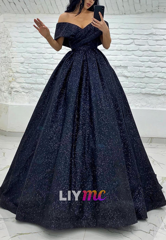 Off-Shoulder Strapless Pleated A-Line Sparkly Prom Dress
