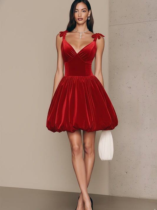 Chic Red Velvet Spaghetti Strap Puff Dress
