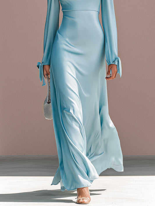 Ice Blue Satin Collar And Flowing Ribbon Long Dress