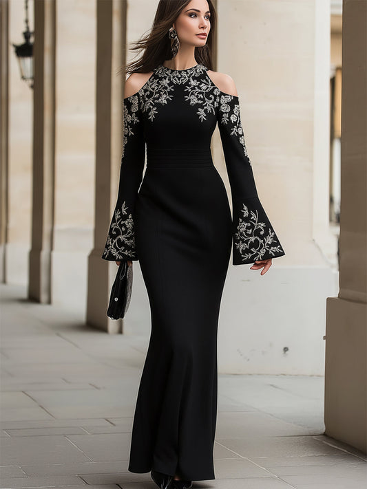 Elegant Black Cold-Shoulder Maxi Dress With Embroidery