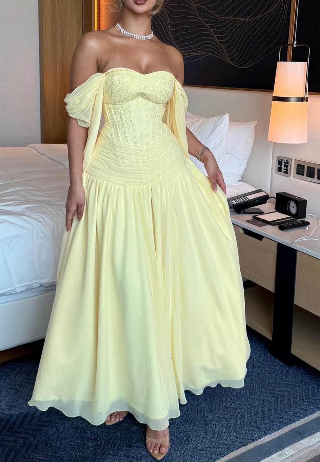 This refined off-shoulder dress presents a study in elegant simplicity. The meticulously pleated A-line silhouette creates a graceful drape that flatters the figure while offering effortless movement. The sleeveless design showcases the décolletage with tasteful sophistication, striking the perfect balance between allure and restraint. An exemplary choice for discerning guests at cocktail soirées and evening gatherings.