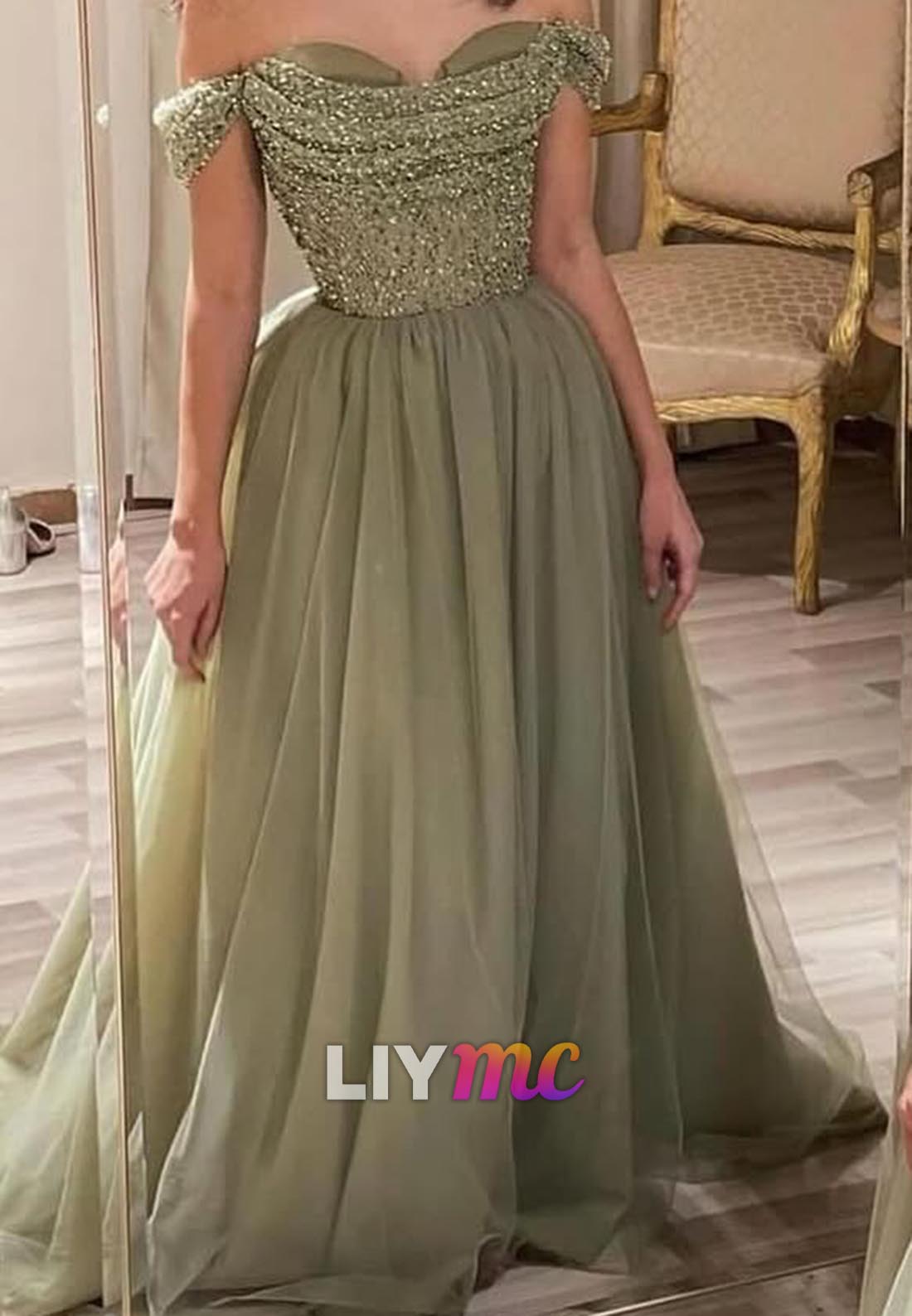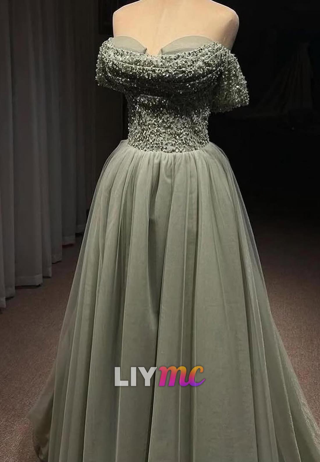 Off-Shoulder Beaded Pleated Tulle A-Line Prom Dress x 1;