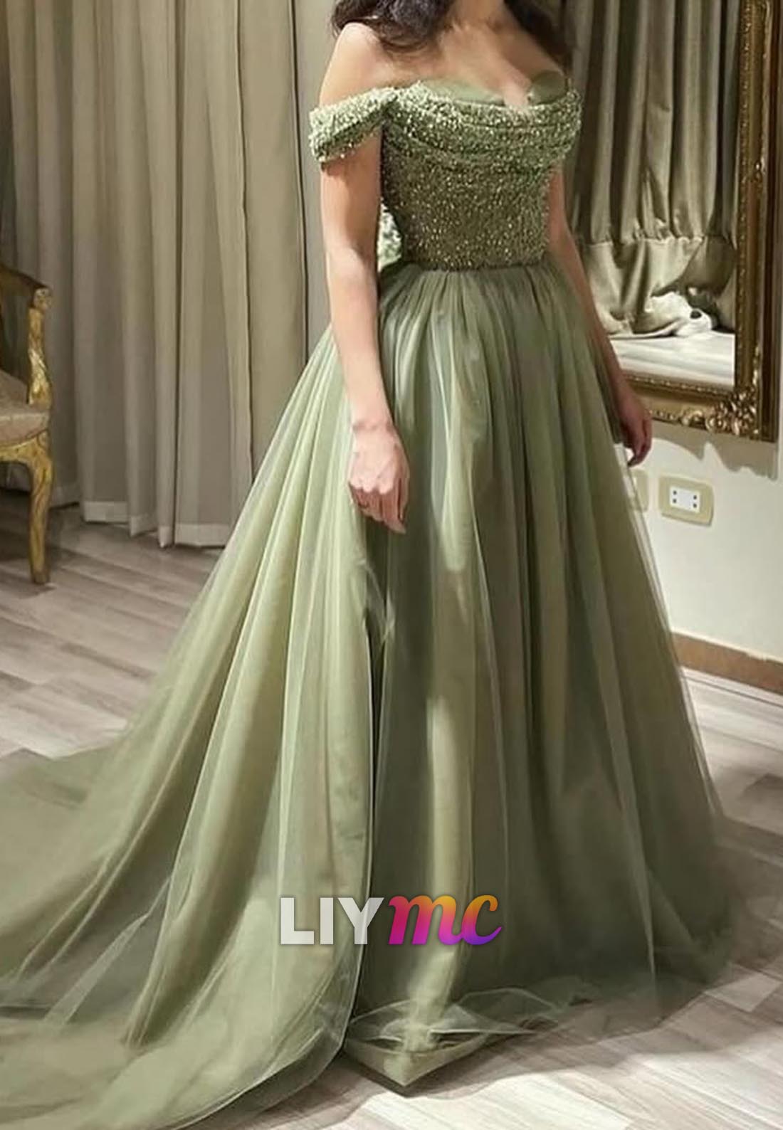 The Off-Shoulder Beaded Pleated Tulle A-Line Prom Dress combines delicate craftsmanship with elegant design. Featuring an off-shoulder neckline and intricate beading, this dress highlights your shoulders with subtle sophistication. The pleated tulle skirt flows gracefully in an A-line silhouette, creating a timeless and refined look perfect for prom or formal occasions.